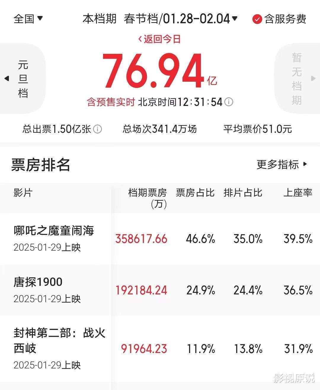 今年春节档的总票房已经达到了77亿人民币,而仅仅只是《哪吒2》这一部影片的票房就已经接近36亿人民币,占据档期总票房的46.6%,明天过后可能就会突破50%。